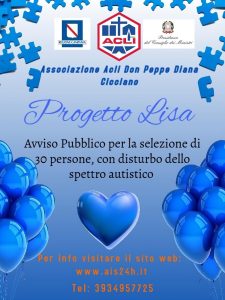 Il presente avviso è finalizzato alla selezione di n. 30 soggetti destinatari delle attività previste dal progetto   LISA: Laboratori di integrazione per persone con disturbo dello Spettro Autistico”, finanziato dalla Regione Campania mediante AVVISO PUBBLICO PER L’ACQUISIZIONE DELLE MANIFESTAZIONI DI INTERESSE DI ENTI DEL TERZO SETTORE ALLA REALIZZAZIONE DI INTERVENTI DIRETTI ALLE PERSONE CON DISTURBO DELLO SPETTRO AUTISTICO.